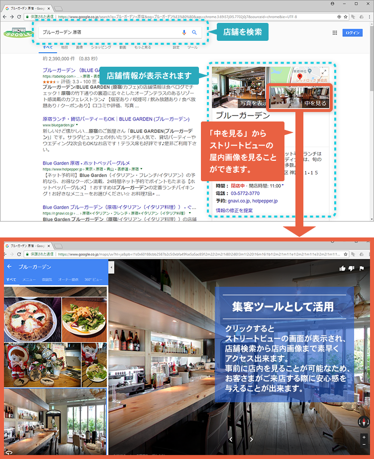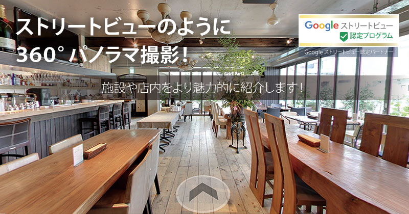 Google検索、Googleマップ、Google+で、店舗・施設の中を 360°のパノラマ画像で疑似体験できるサービスです。